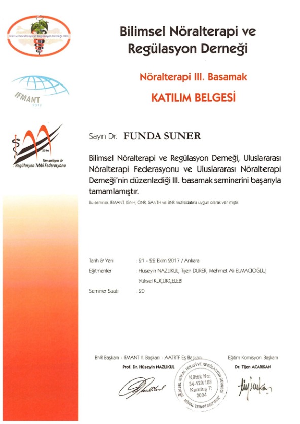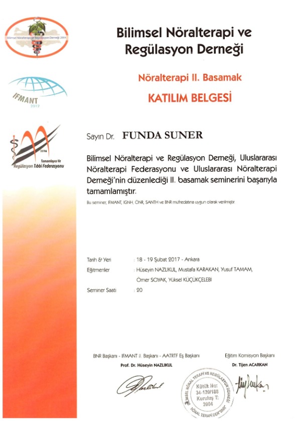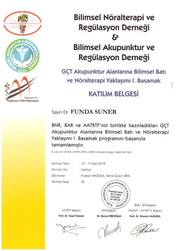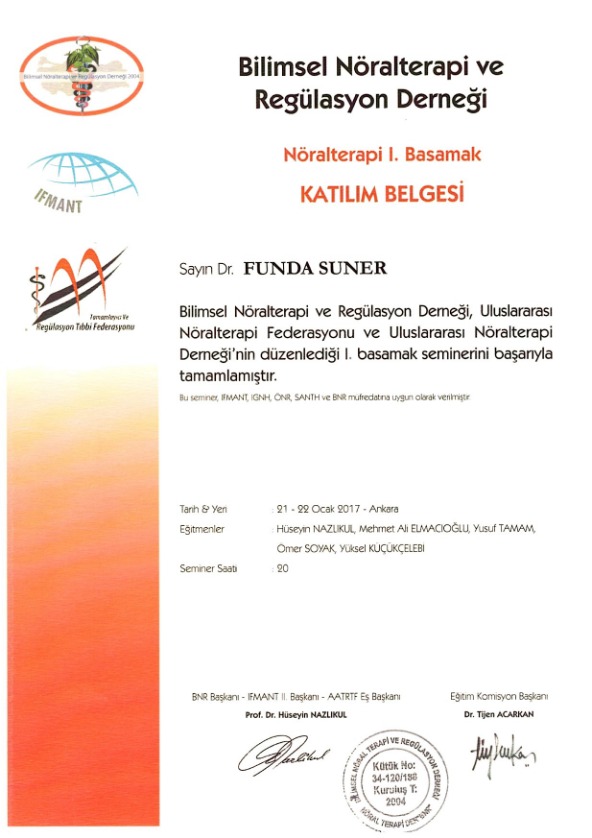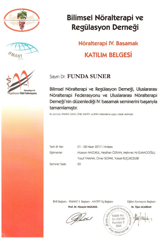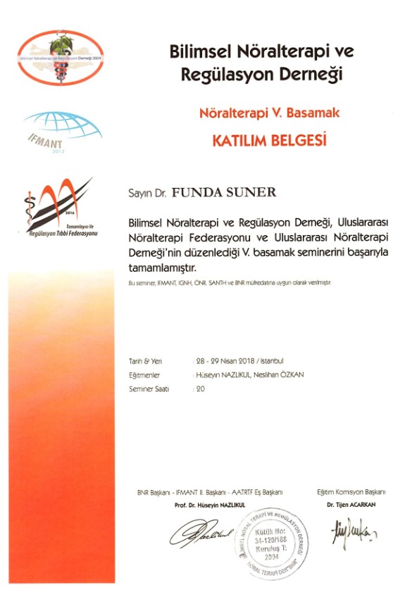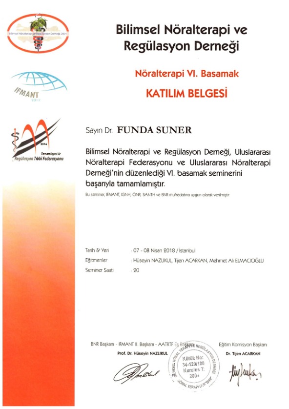 - Bilimsel Nöralterapi ve Regülasyon Derneği ve IFMANT Mezuniyet Sertifikası (Eylül 2019)