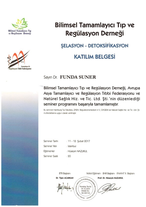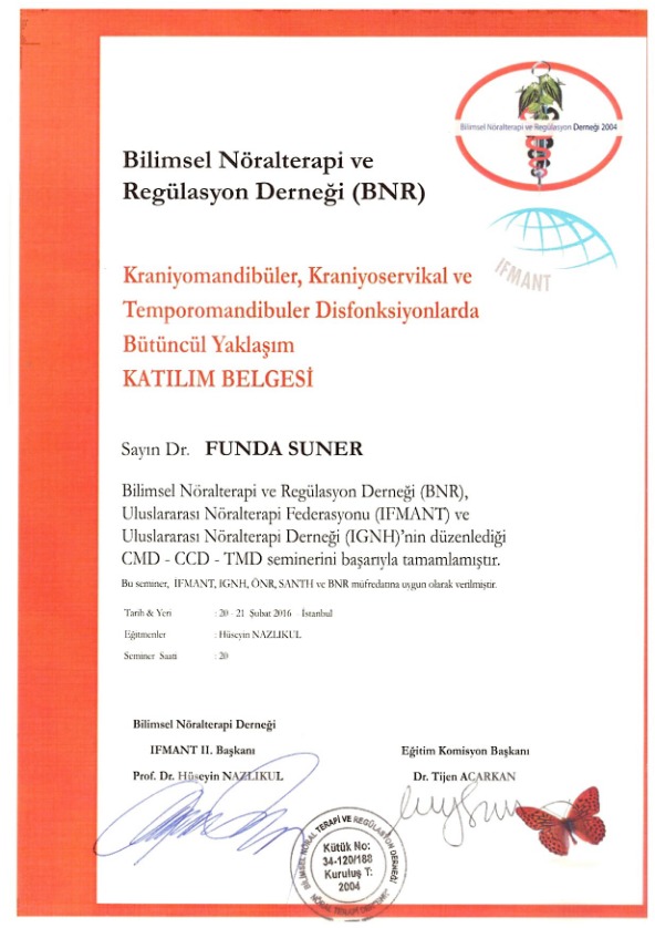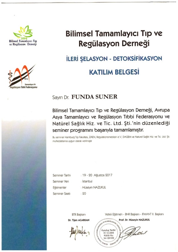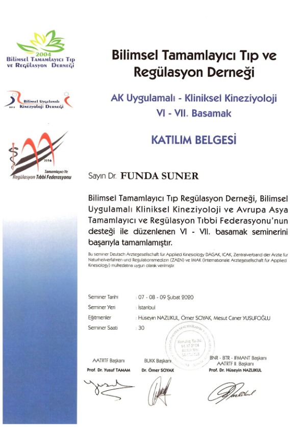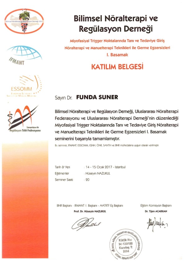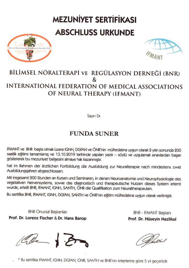 - Bilimsel Nöralterapi ve Regülasyon Derneği ve IFMANT Mezuniyet Sertifikası (Eylül 2019)