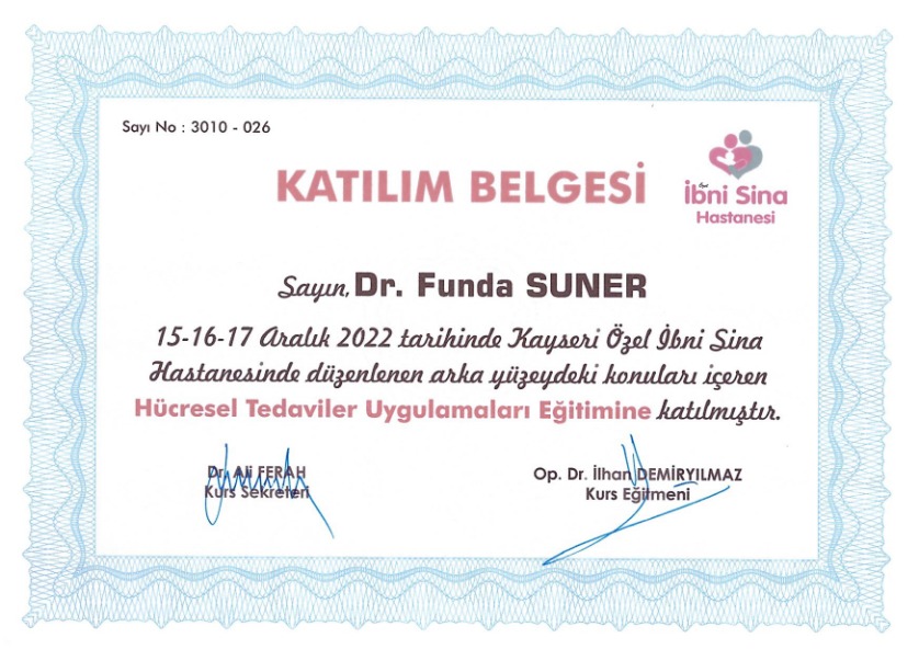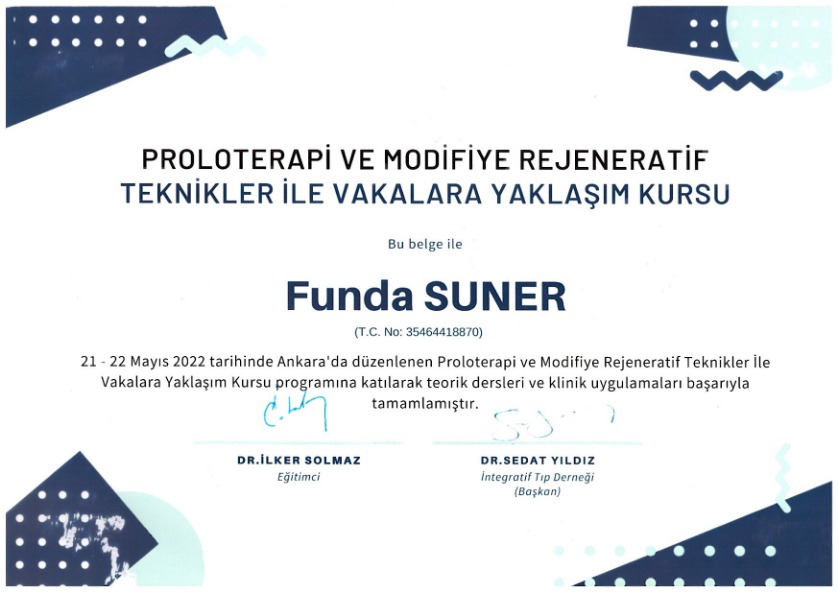 - Sağlık Bakanlığı Onaylı Sertifikalı Proloterapi Eğitimi – İstanbul Bağcılar Eğitim Araştırma Hastanesi (Haziran 2018 – Eylül 2018)