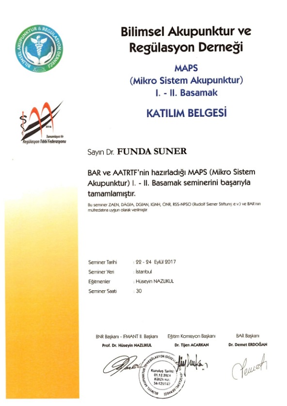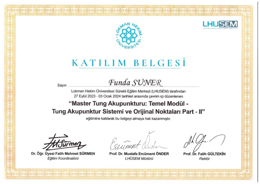 - Sağlık Bakanlığı Onaylı Sertifikalı Akupunktur Eğitimi – Yeditepe Üniversitesi (Eylül 2019 – Şubat 2020)