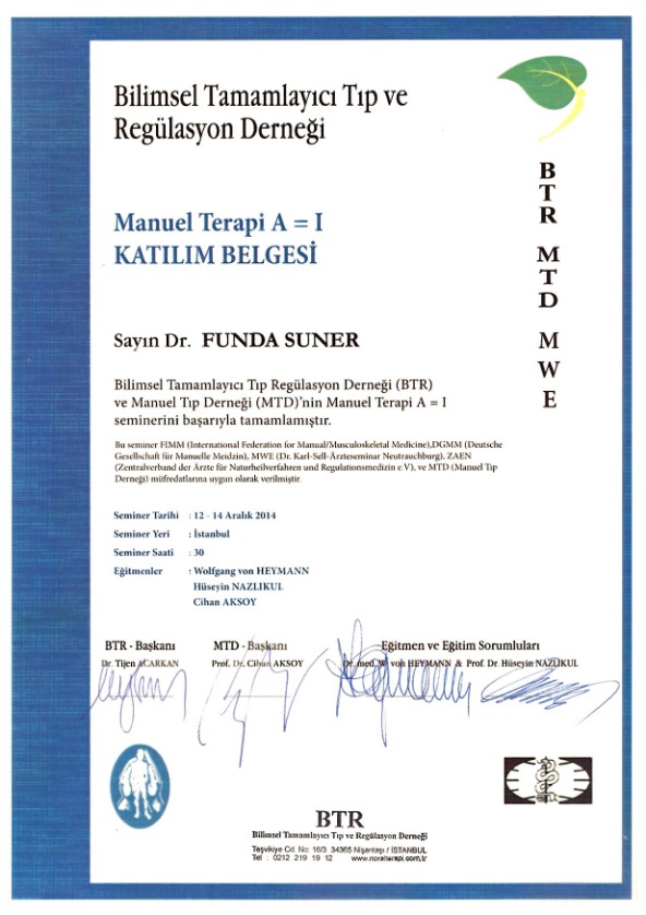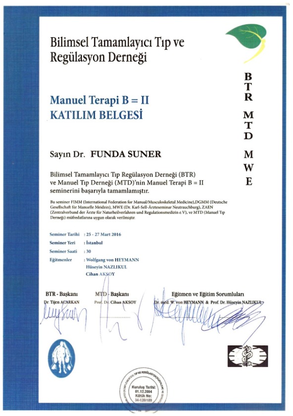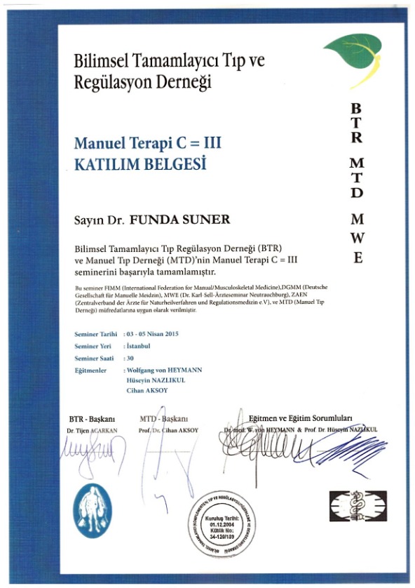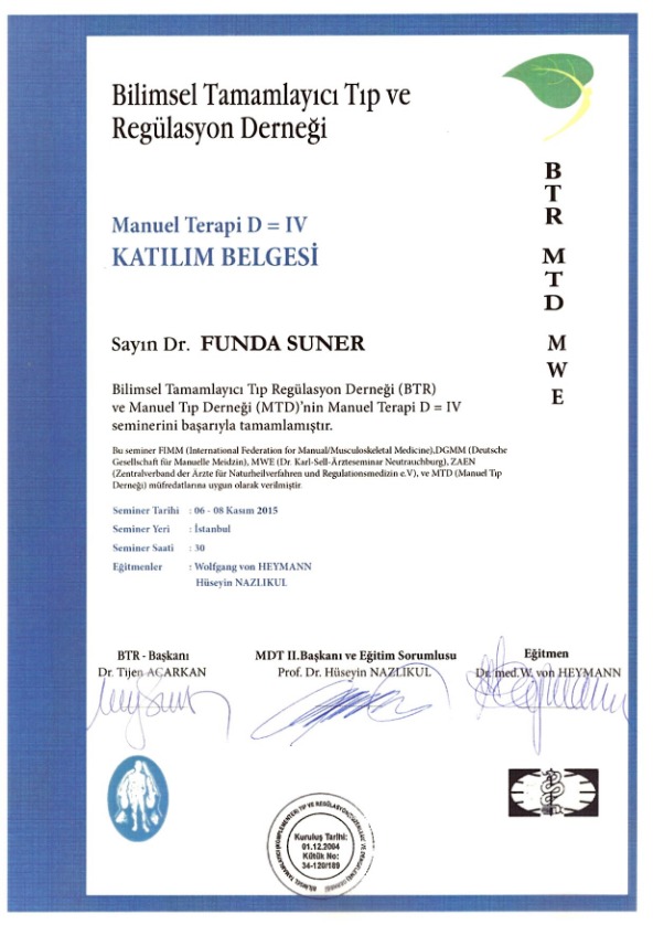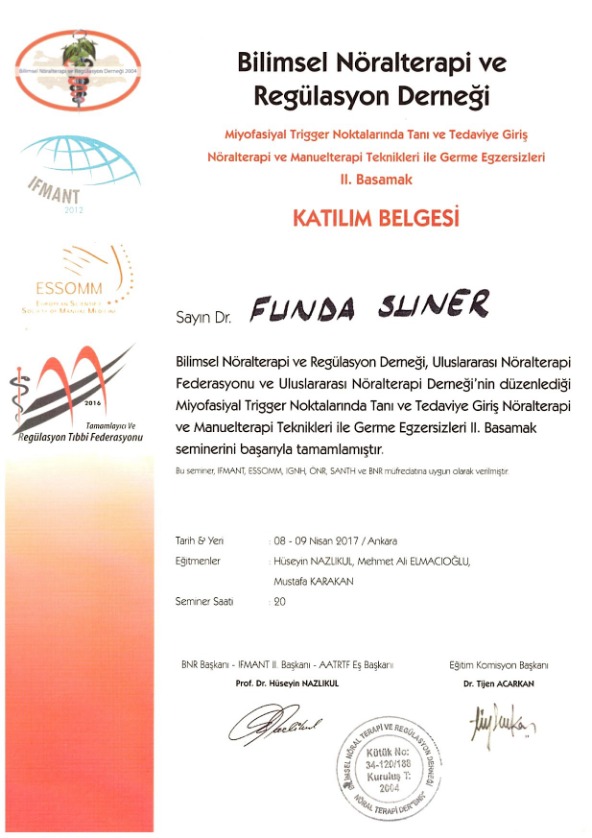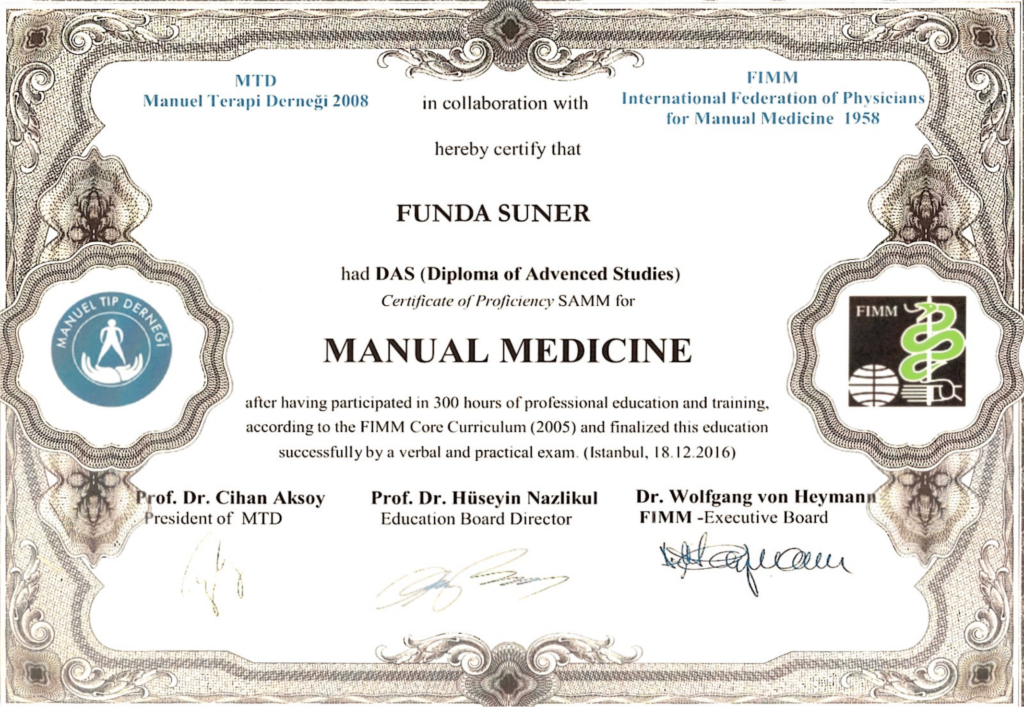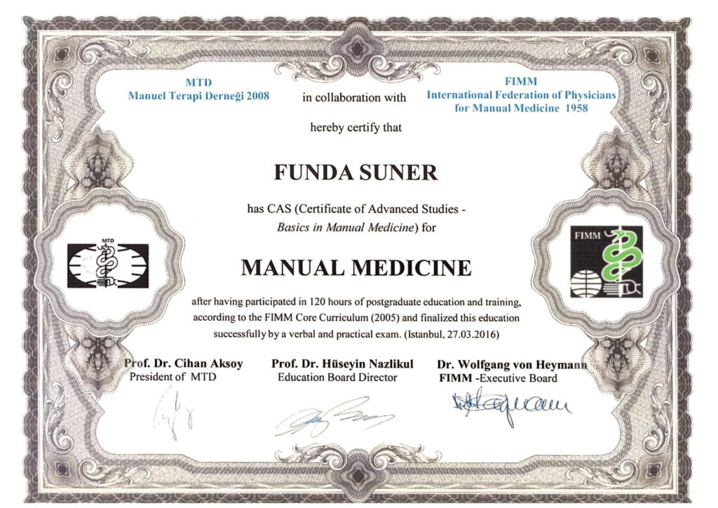 - International Federation of Physicians for Manual Medicine (FIMM) Certificate of Advanced Studies (Aralık 2016)