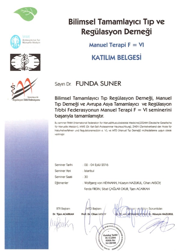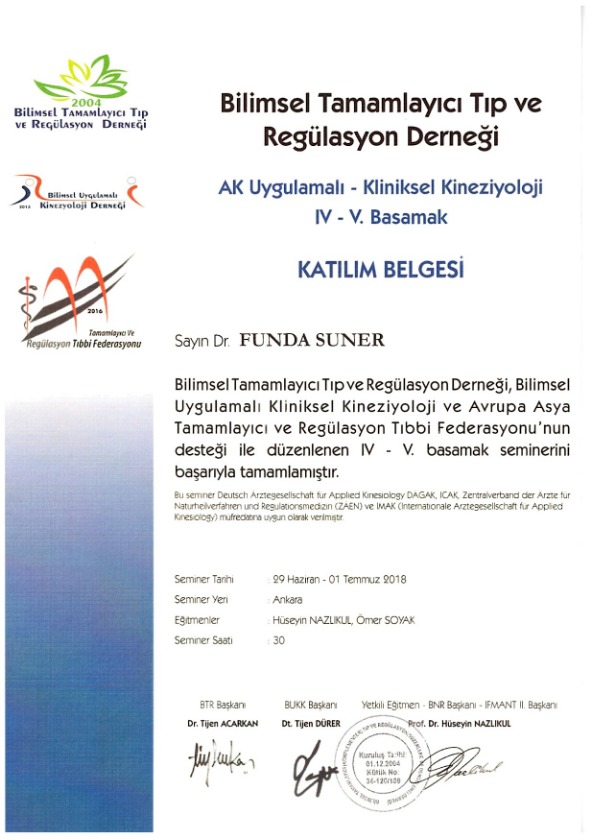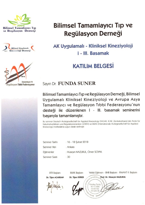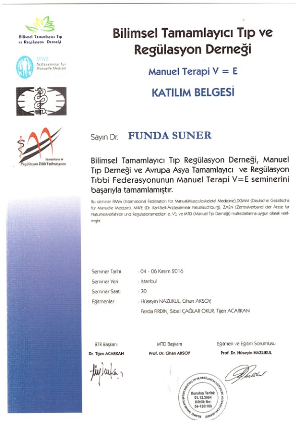 - Bilimsel Tamamlayıcı Tıp ve Regülasyon Derneği Manuel Terapi 1-8. Basamak (2014-2016)